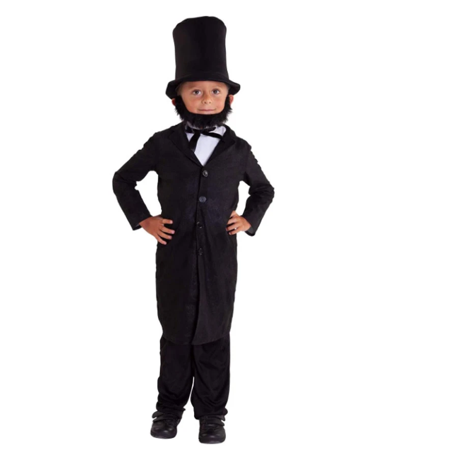 Include: giacca nera lunga e pantaloni abbinati, camicia frontale con cravatta, iconico cappello alto di Lincoln e accessorio barba.Questo costume per adulti è disponibile in 3 taglie: S, M e L. Usare l’immagine di riferimento per la misura delle taglie.Materiali di alta qualità, facile da indossare e resistente.Sicuro per i bambini: rispetta gli Standard di Sicurezza EU e UK ed ha il marchio di sicurezza CE.