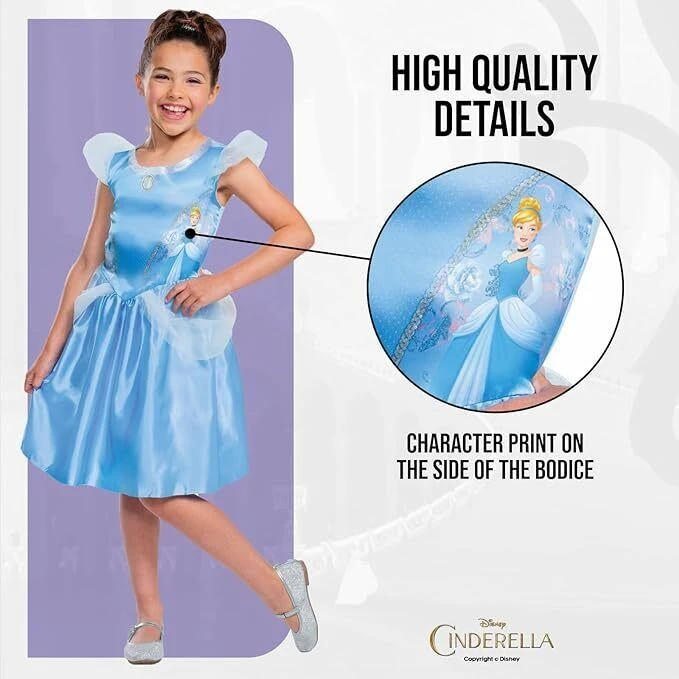 Sii la bella del ballo reale con questo vestito ufficiale di Cenerentola Disney. Include vestito.Abito in raso di alta qualità, con adorabile stampa del personaggio sul lato del corpetto e tutti i luccichii e le scintille di cui la tua piccola ha bisogno per trasformarsi nella sua Principessa Disney preferita.Disponibile in una taglia: XS (3-4 anni), S (5-6) e M (7-8); Usare l’immagine di riferimento per la misura delle taglie.Il nostro design è sicuro per i bambini, rispetta gli Standard di Sicurezza EU e UK ed ha il marchio di sicurezza CE.