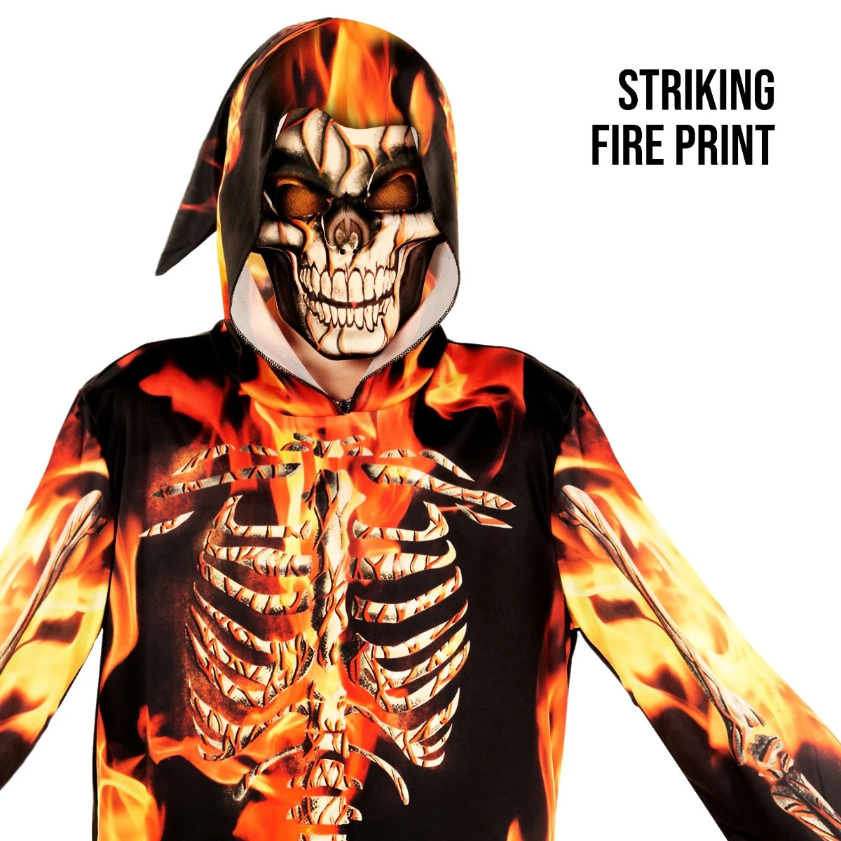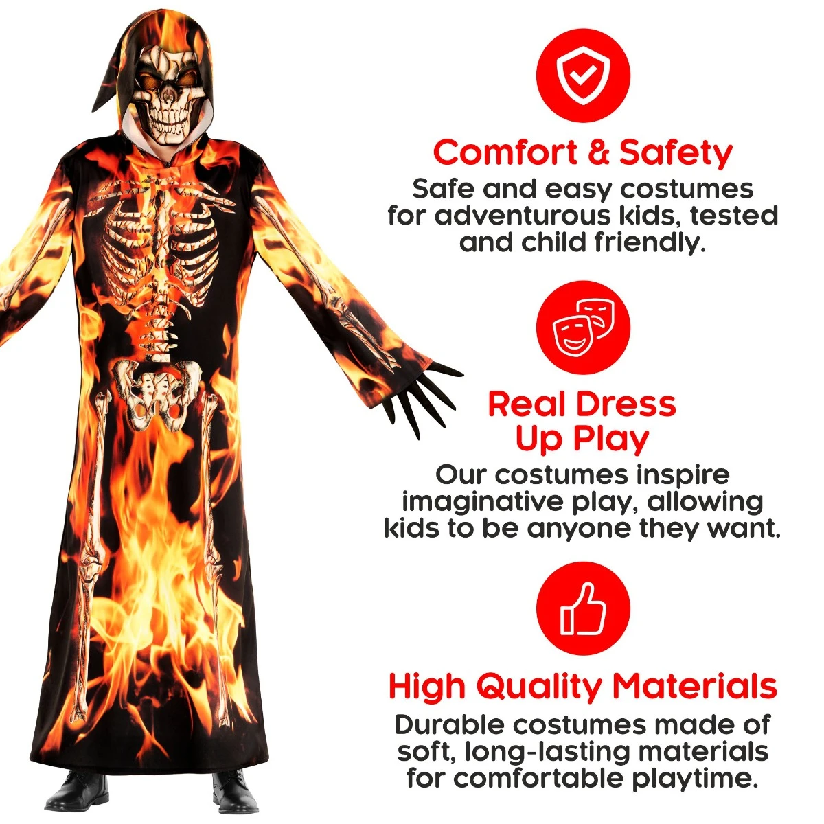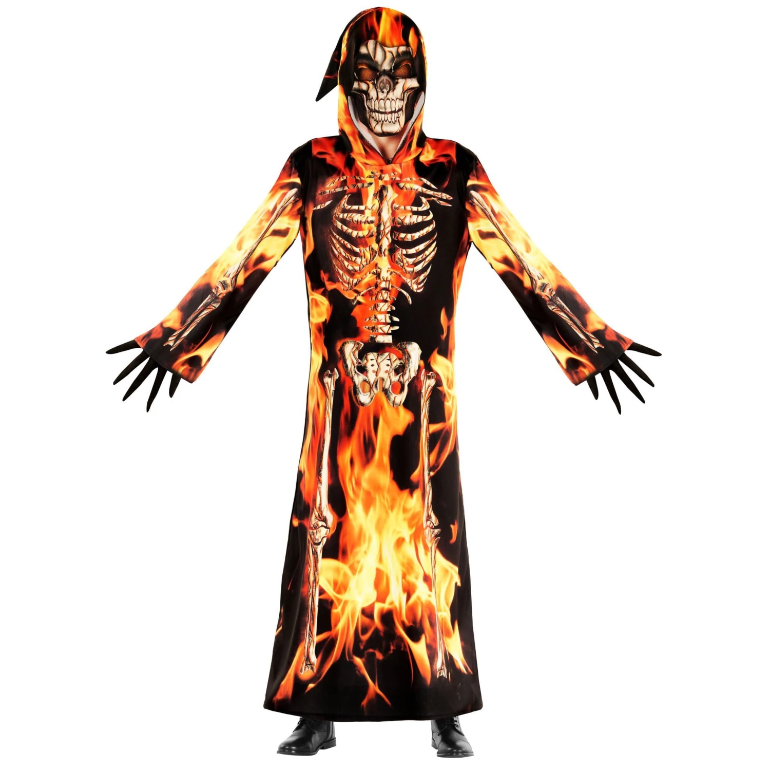 Se il tuo bambino vuole interpretare il ruolo del cupo mietitore ispirato al fuoco con Halloween, non cercare oltre il costume di Halloween per i bambini Grim Reaper, completo di un motivo scheletro in fiamme. Questo spaventoso costume per bambini include un abito dettagliato e una maschera spaventosa per aiutare il bambino a dominare Halloween. Ordina oggi quello di tuo figlio.