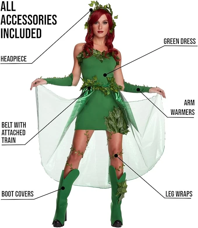 Il costume da edera mortale da donna permette di portare un tocco di minaccia a qualsiasi festa con un tocco velenoso e mortale. Ogni costume è composto da un abito verde di alta qualità, cintura con strascico, scaldabraccia, copristivali e un copricapo per completare l’outfit. Deadly Ivy è l’antidoto perfetto per una festa piena di supereroi.
