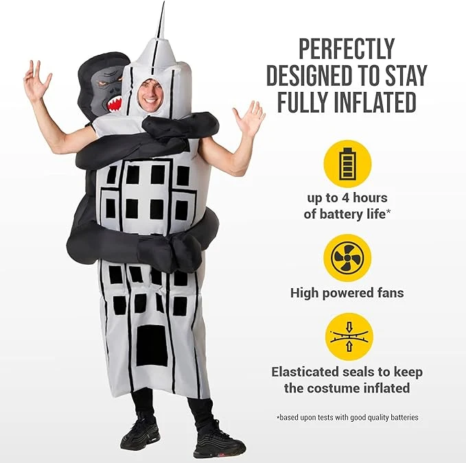 Il costume include: Costume gonfiabile con ventola ad aria incorporata (batterie x 4 AA richieste e non incluse).Il costume è in taglia: Adulti.Materiali di alta qualità, facile da indossare e resistente. Usare le istruzioni per gonfiare.La nostra Azienda è stata fondata nel 2009 da 3 amici appassionati di costumi. Abbiamo uffici in USA, UK ed Europa con centinaia di design che rispettano il massimo degli standard di qualità.