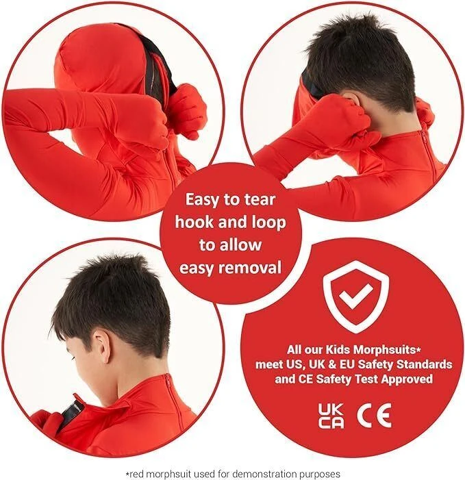 Include una Morphsuit pezzo unico con cappuccio in velcro per una facile rimozione. Materiale di alta qualità elastico in 4 direzioni, cerniera resistente e cuciture rinforzate nei punti di stress.Questo costume per bambini è disponibile in 3 taglie: S (91 – 104 cm), M (105 – 119 cm) e L (120 – 137 cm). Usare l’immagine di riferimento per la misura delle taglie. Costume facile da indossare, resistente e di alta qualità. Si può bere, vedere e respirare attraverso la stoffa. Lavare in acqua fredda, asciugare all’aria.Sicuro per i bambini: rispetta gli Standard di Sicurezza EU e UK ed ha il marchio di sicurezza CE.