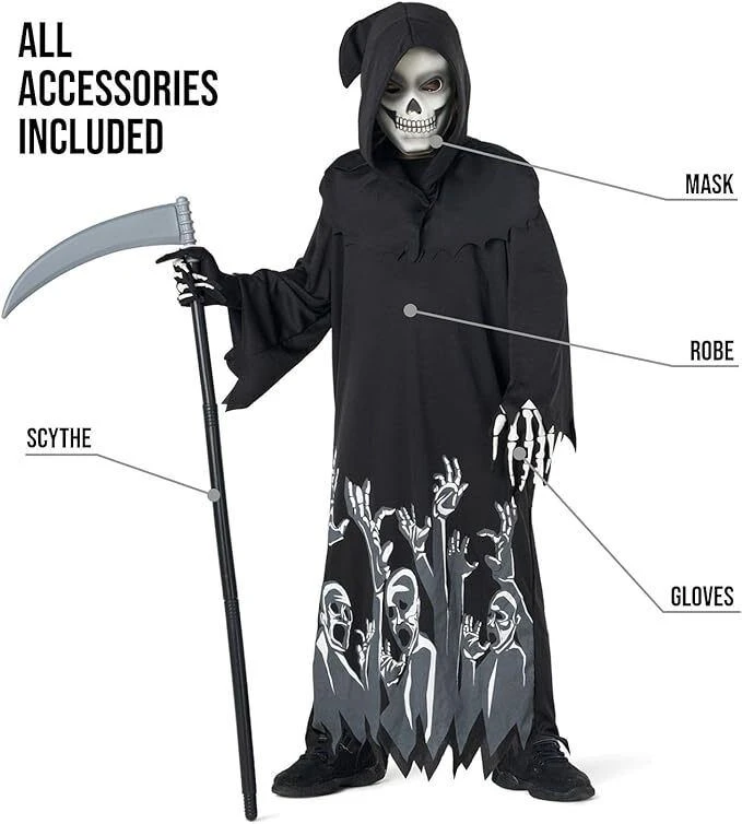 Se il tuo bambino vuole interpretare il ruolo del cupo mietitore ispirato al fuoco con Halloween, non cercare oltre il costume di Halloween per i bambini Grim Reaper, completo di un motivo scheletro in fiamme. Questo spaventoso costume per bambini include un abito dettagliato e una maschera spaventosa per aiutare il bambino a dominare Halloween. Ordina oggi quello di tuo figlio.