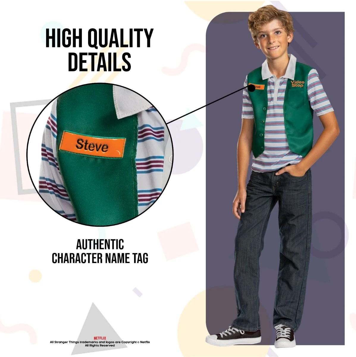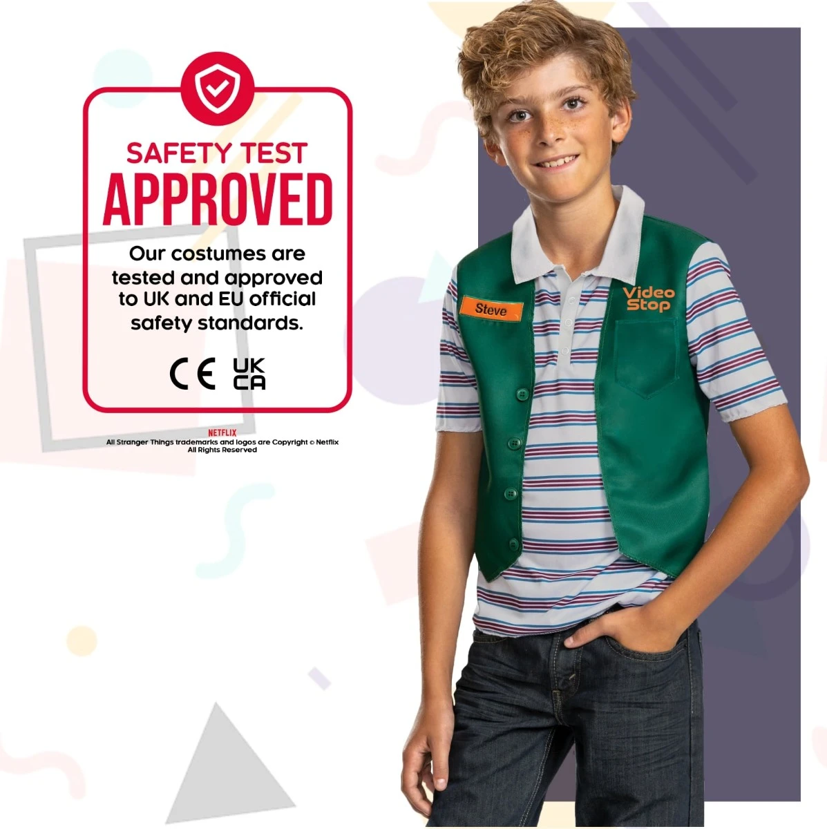 Move on from Scoop Ahoy to Family Video with this official Steve costume. A high quality, comfortable, durable, & easy-to-wear outfit, based on Netflix Stranger Things Season 4. Live out your supernatural adventures with this authentic Steve costume. Perfect for Halloween dress outfits, World Book Day, fancy dress parties, roleplay and cosplay.