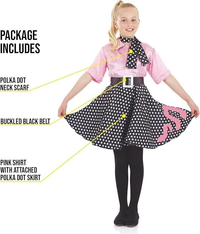 Il costume include: un vestito rosa con gonna circolare nera a pois bianchi, una cintura nera con fibia e un foulard a pois abbinato.Questo costume per bambini è disponibile in taglia: S, M, L, XL. Usare l’immagine di riferimento per la misura delle taglie. Materiali di alta qualità, facile da indossare e resistente.Sicuro per i bambini: rispetta gli Standard di Sicurezza EU e UK ed ha il marchio di sicurezza CE.